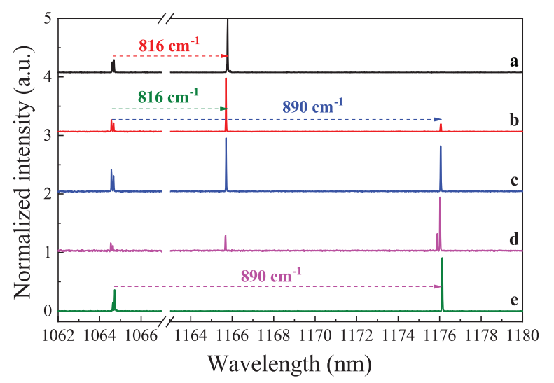 图1:被动调Q拉曼微片激光器的在不同f情况 (a:f = 0°,1166 nm拉曼光振荡;b:f = 30°,c:f = 45°,d:f =60°,1166 nm和1176 nm双波长拉曼激光同时振荡;e:f = 90°,1176 nm拉曼光振荡) 的激光光谱。基频光在所有情况下都有振荡