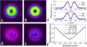 图2:混合矢量涡旋激光的激光横模模式验证。(a)和(d)为实验获得的光斑以及球面波干涉图样,(b)和(e)为对应的理论模拟图样。(c)为光束沿x轴和y轴的强度曲线与理论强度曲线的对比。(f)为混合矢量涡旋激光的光束质量因子。