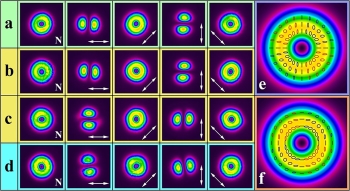 图3:混合矢量涡旋激光的偏振态示意图。(a)-(d)分别展示了光束的原始横模图样和通过不同角度的线偏振片时的光束横模图样。(a) LR = 1 mm,Pin = 3.3 W;(b) LR = 1.5 mm,Pin = 2.4 W;(a) LR = 1.5 mm,Pin = 4.3 W;(a) LR = 2 mm,Pin = 3.6 W。(a)和(b)对应混合径向偏振,偏振态理论分布如(e)所示;(c)和(d)对应混合角向偏振,偏振态理论分布如(f)所示。