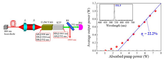 最新有关高效腔内倍频Cr,Nd:YAG/KTP小型化绿光自调Q激光器的研究成果发表在最新一期《IEEE Photonics Technology Letters》(2011年IF:2.191,JCR工程2区)上。在激光二极管泵浦的Cr,Nd:YAG/KTP小型化自调Q激光器中获得532 nm的平均输出功率大于1W的绿光激光输出。激光器的斜率效率为22%,光光转换效率高达13.7%。在超过75 kHz的重复频率下获得了峰值功率大于2 kW的脉冲激光输出。这种小型化的Cr,Nd:YAG/KTP绿光激光器在光学存储、海底通信及激光显示等领域具有非常大的应用潜力。论文的详细内容见IEEE Photonics Technology Letters, 25(9): 848-850 (2013).
